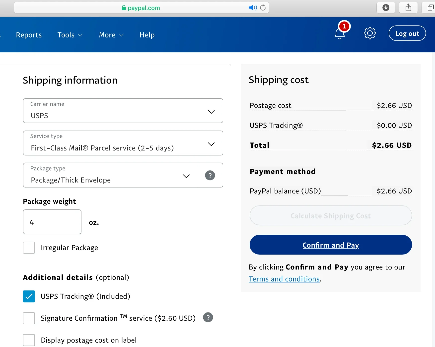 Go to this link on PayPal (save this link to your computer). After clicking on the link and logging into your account, you’ll find a 'Ship to address’ screen. Input your customers shipping formation. You’ll be directed to the shipping information screen. Select shipping options, package type and package weight. See the types I use below!